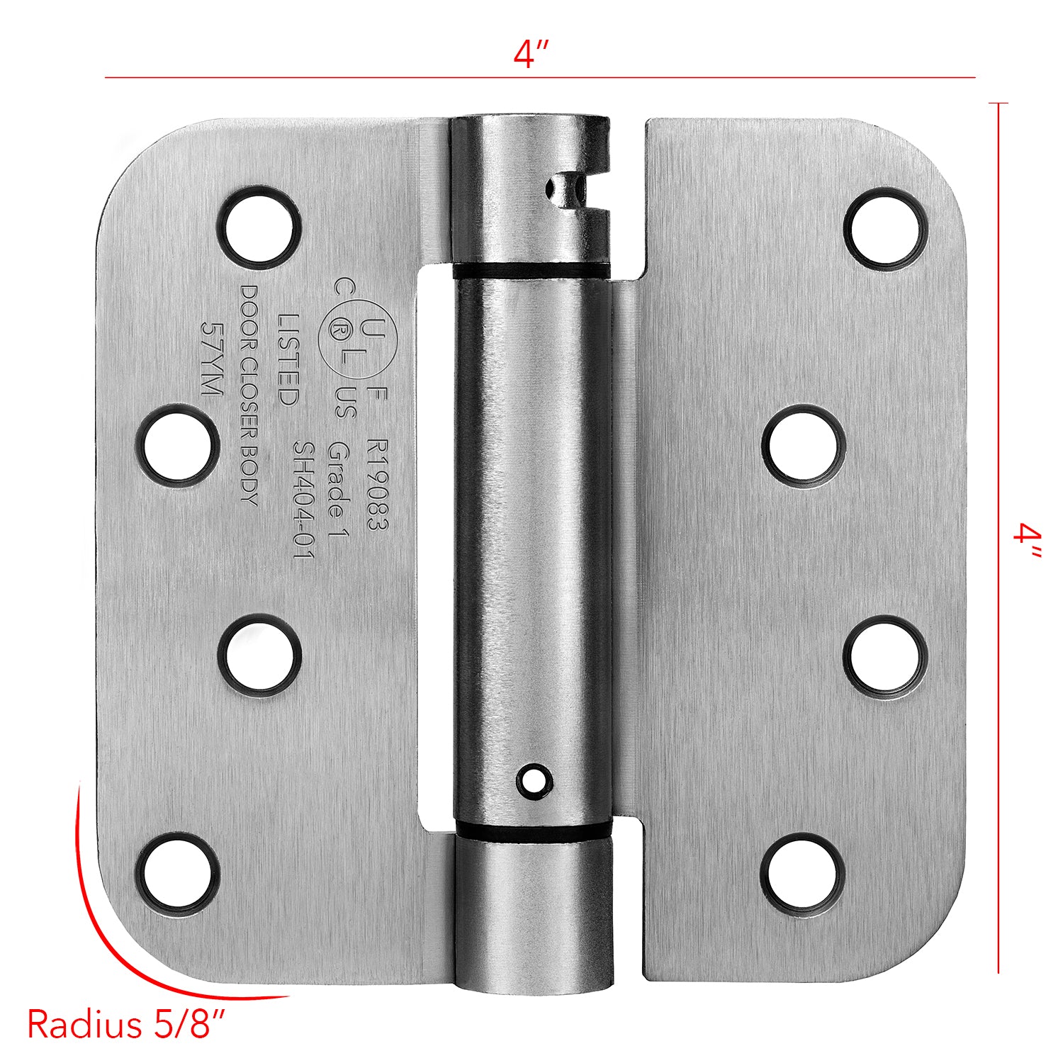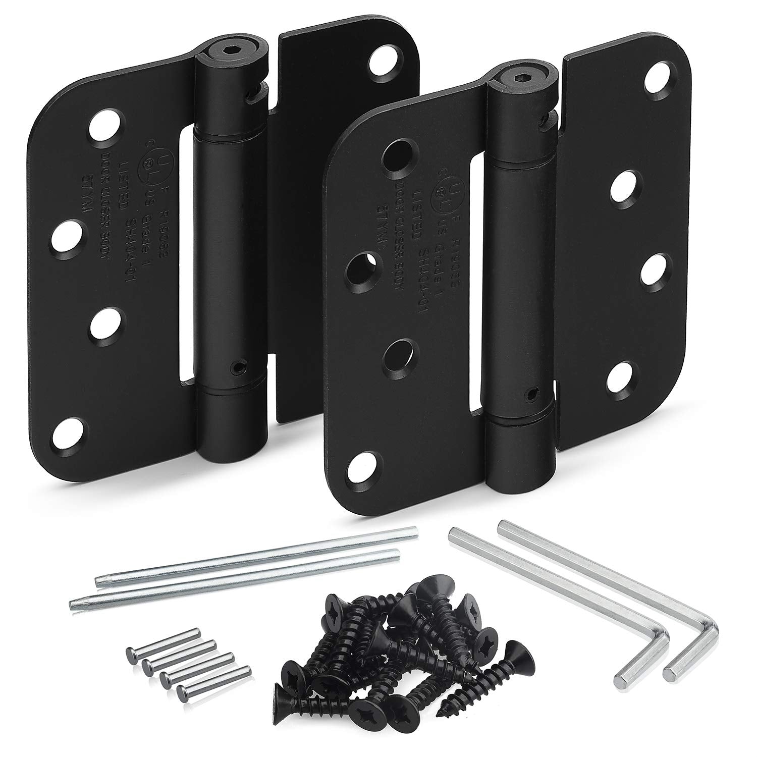 - Includes 2 Hinges, 4" x 4" with 5/8 radius corners. Hex wrench, tension rods, and matching installation screws included for your convenience.